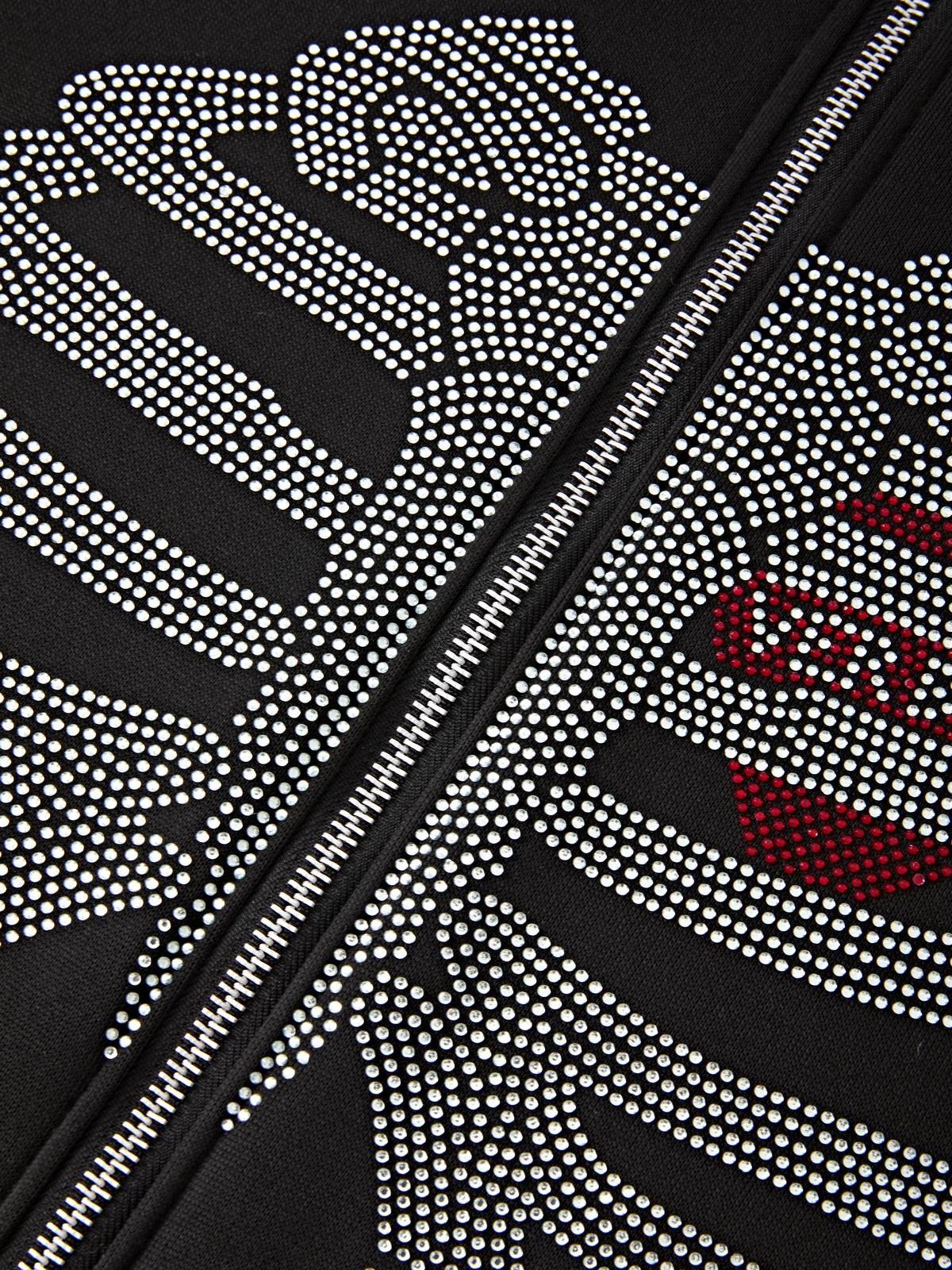 >Beschreibung: Aktualisiert mit diesen Hoodies für festliche Halloween-Stimmung. Zu einer entspannten Silhouette geschnitten, mit Strass-Schädelgesicht und Skelettknochenmuster auf der Vorderseite, mit funktionellen Taschen, überschnittenen Schultern und einem Design mit Reißverschluss.