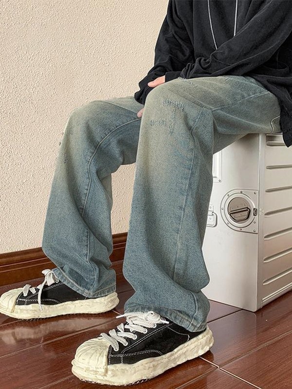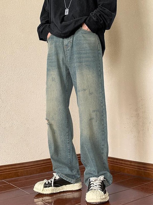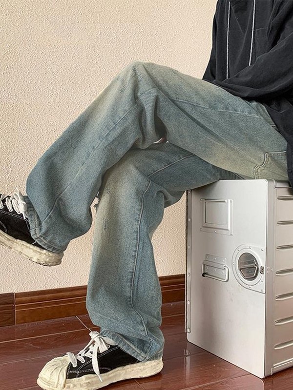 Beschreibung: Diese Jeans hat leicht ausgefranste Risse am Bein, mit mehrere Gürtelschlaufen und Taschendetails vorne und hinten.