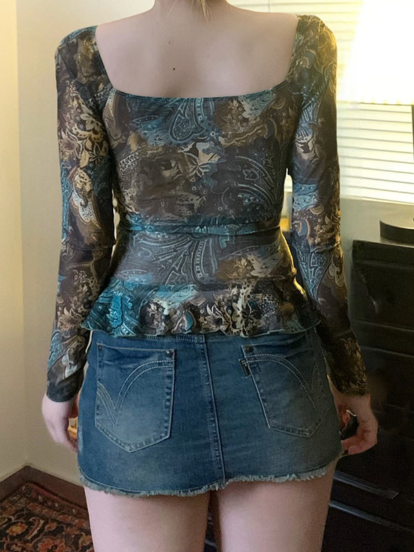 Bedrucktes Langarmshirt mit Rüschen und Krawattenkragen